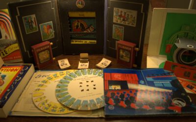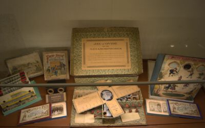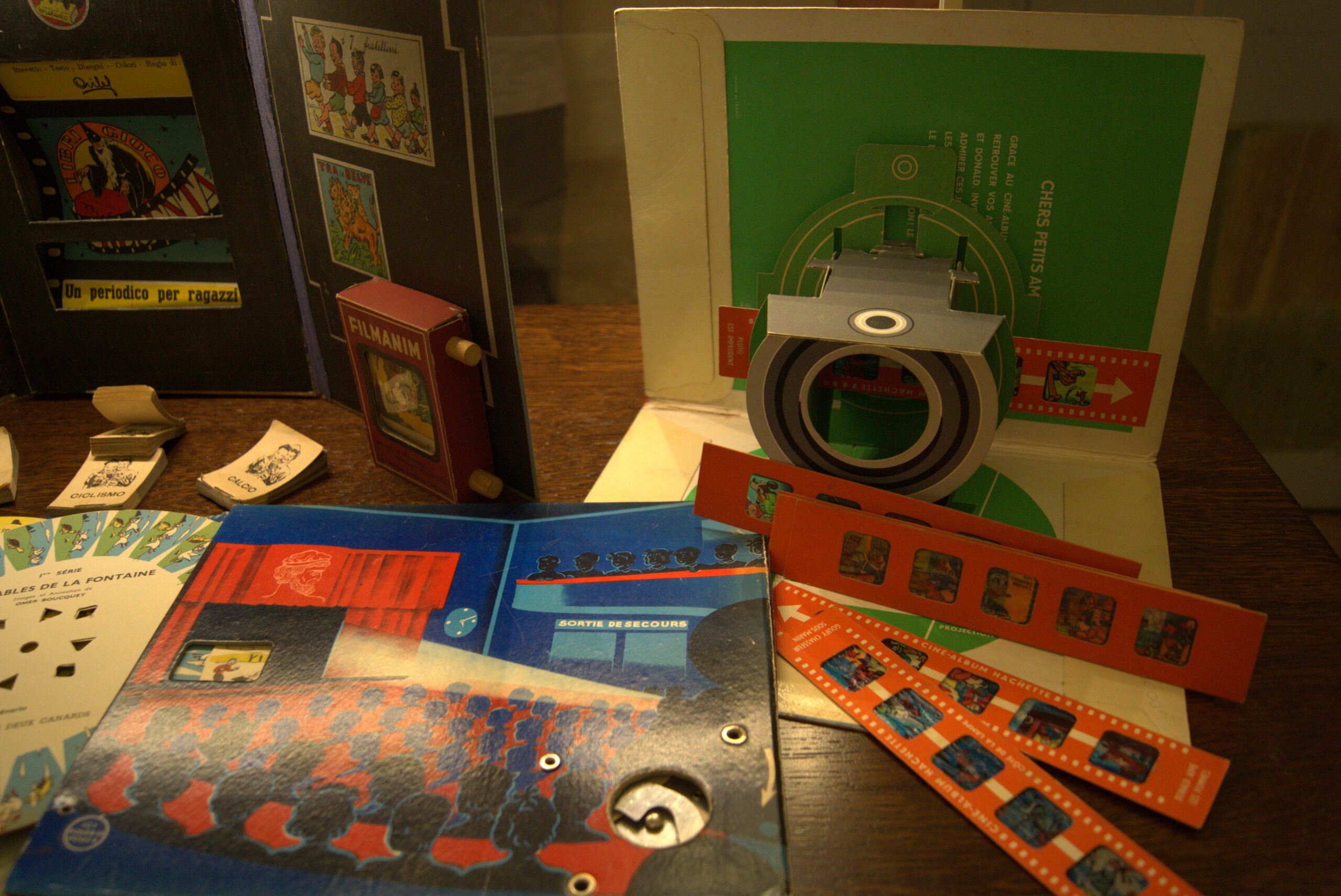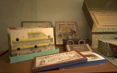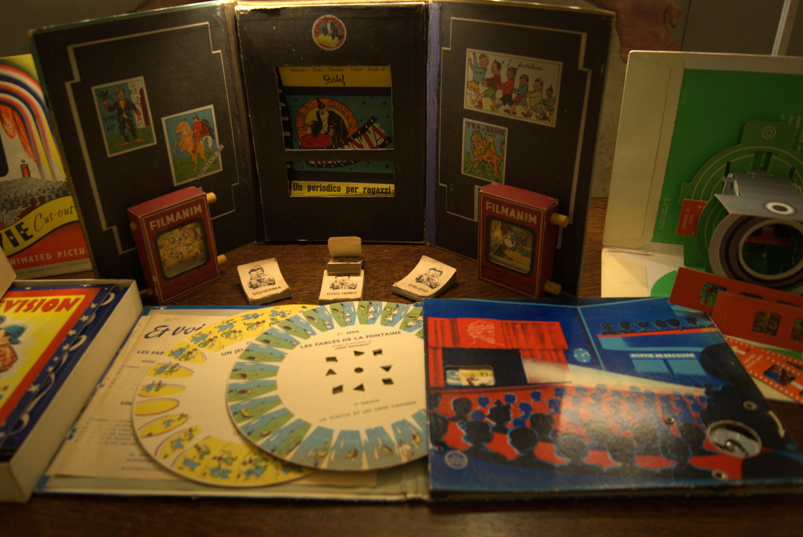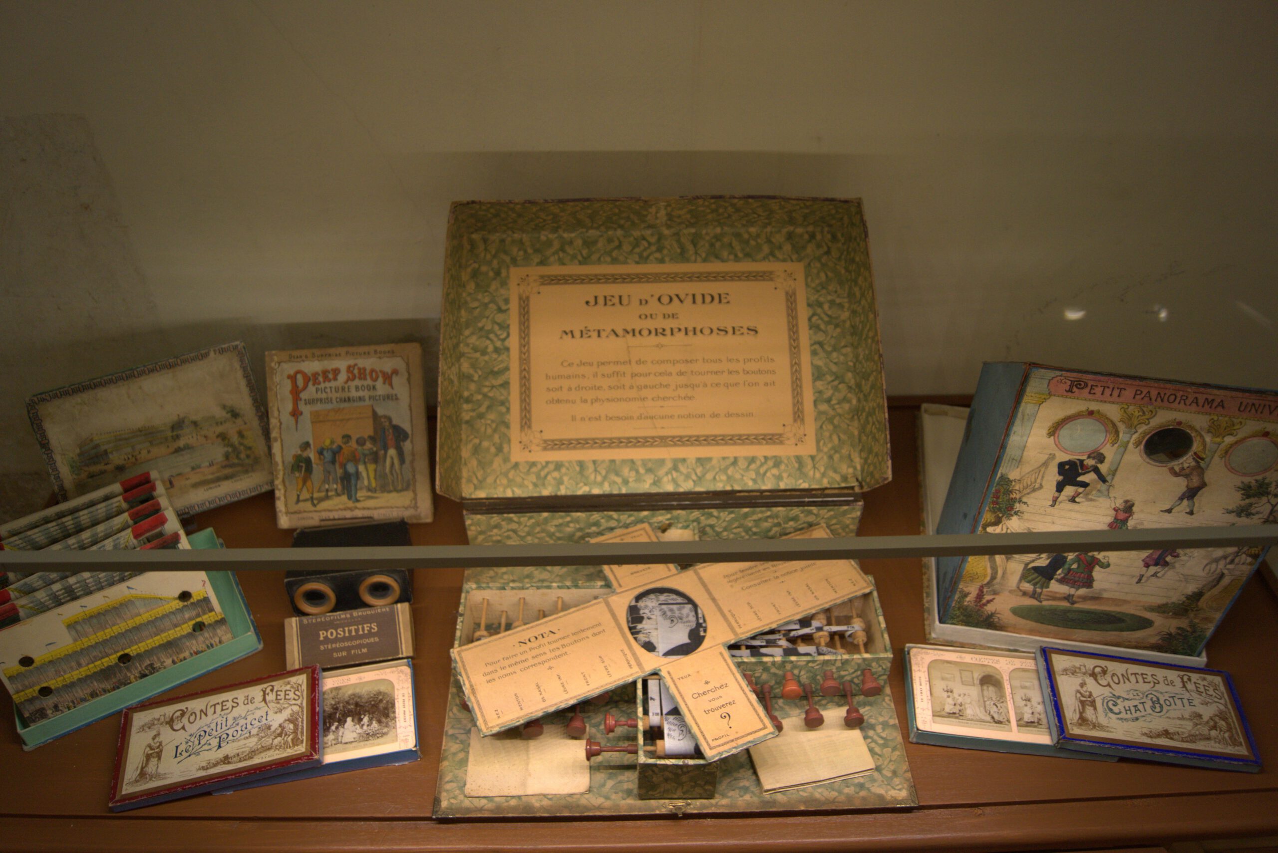 Una specifica sezione del Pop-App Museum presenta una rassegna di materiali che dimostrano come intorno a metà Ottocento nell’editoria per l’infanzia si assiste a uno sforzo di ingegneria ludica senza precedenti per introdurre all’interno del libro “effetti speciali” in grado di cogliere gli stimoli e le suggestioni derivanti dalla diffusione sempre più ampia dei materiali del precinema in forma di giocattolo. Un passaggio efficace e suggestivo dalla bidimensionalità della pagina alla tridimensionalità della scena, evocando profondità e prospettiva. Sono esposti in mostra libri che si ispirano direttamente ai dispositivi stereoscopici e che, tramite l’utilizzo di occhialini, permettono di vedere con effetti tridimensionali e/o di movimento le tavole, opportunamente stampate in due colori (generalmente ciano/magenta o alcune varianti). Sono presenti anche giochi attraverso cui, in continuità con i teatrini di carta settecenteschi, si possono costruire delle vere e proprie sale cinematografiche utilizzando, per animare i soggetti, occhialini, dischi mobili e ruote kinematoscopiche.